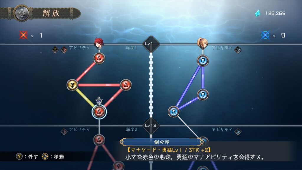 中心となるのは「レリーズ・ライン」と呼ばれるスキルパネルです。これは、解放したスロットに「攻撃力アップ」「防御力アップ」といった能力強化オーブ(マナシード)を、プレイヤーが自由にはめ込んでいくシステムです。攻撃特化にしたり、防御を固めたりと、自分のプレイスタイルに合わせてキャラクターをカスタマイズできる自由度の高さは、素晴らしいと感じました。
