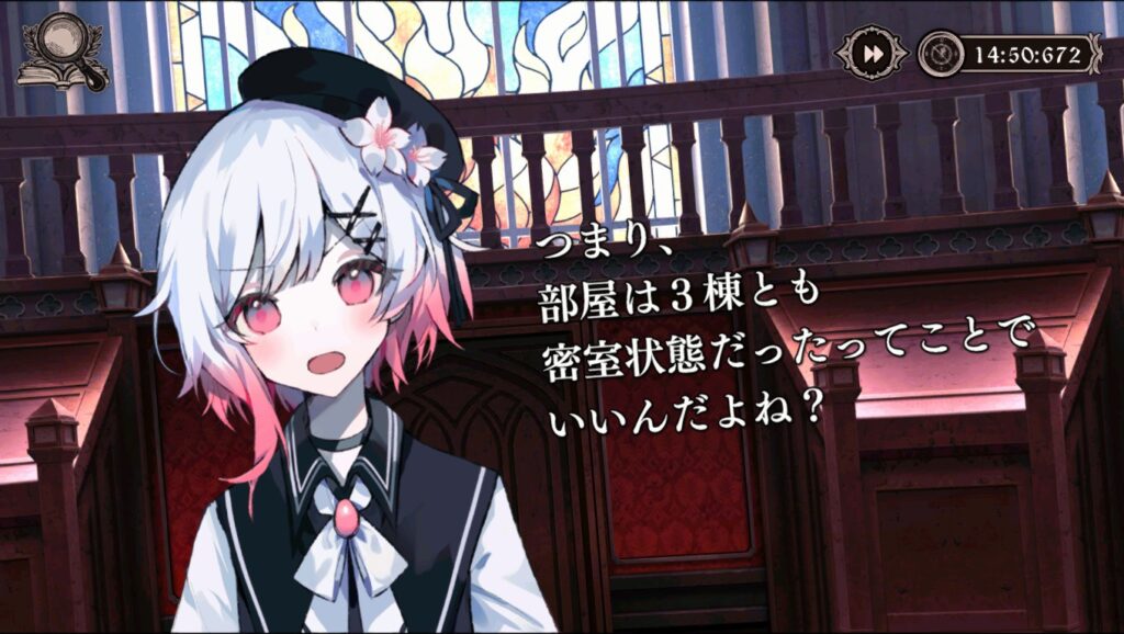 ここでは、各キャラクターの発言が次々と表示されていきます。その中で矛盾した発言や重要なキーワードを見つけ出し、証拠を突きつけて反論していくことで、プレイヤーは自らの手で謎を解き明かしていくことになります。この推理のプロセスは、ミステリーゲームとして非常に面白い体験でした。