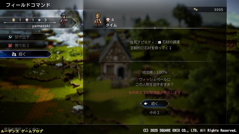 町の人々もそれぞれ役割を持って働いてくれそうな雰囲気があったり、各街の人々に話しかけ、「聞き出す」「招く」といったフィールドコマンドを使って住人を増やしていくなど、交流を楽しむこともできます。